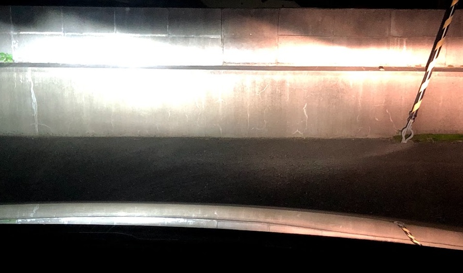まずは明るさ比較。わかりやすいように純正ハロゲンと。明るさはもちろん、照射範囲の広さも「素晴らしい」の一言。加えてカットラインもキッチリ出ているのが一目瞭然。